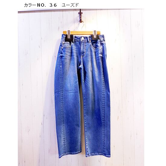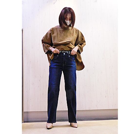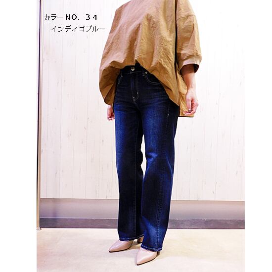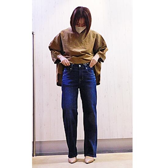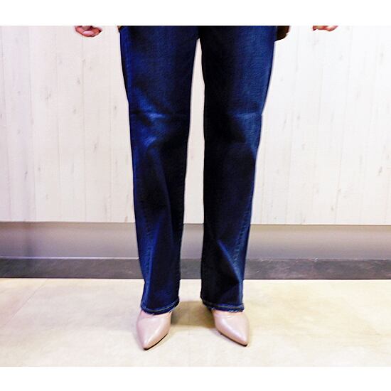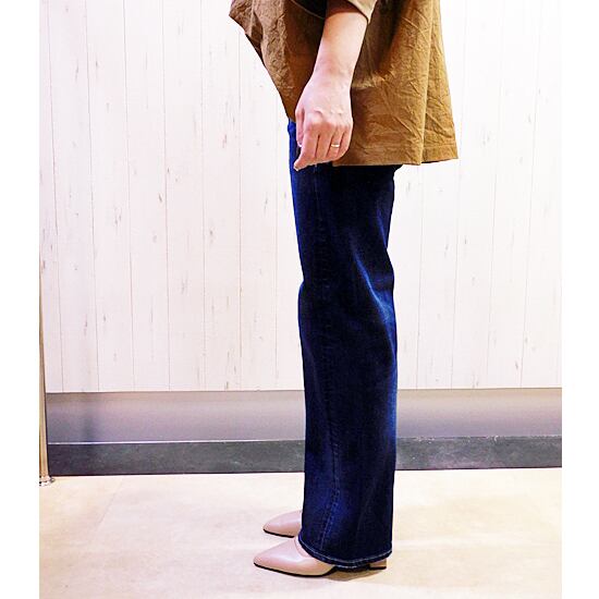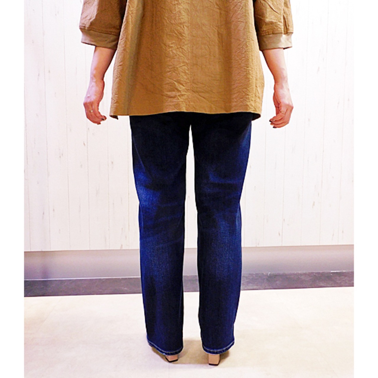 柔らかい生地のウエスト後部分が少しゴム仕様になったストレートデニムパンツ