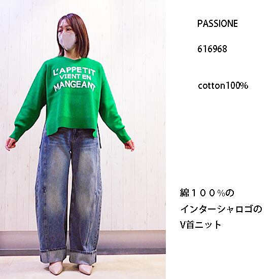 ff85 PASSIONE綿100%インターシャロゴV首ニット616968
