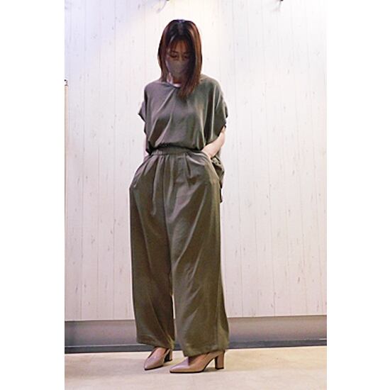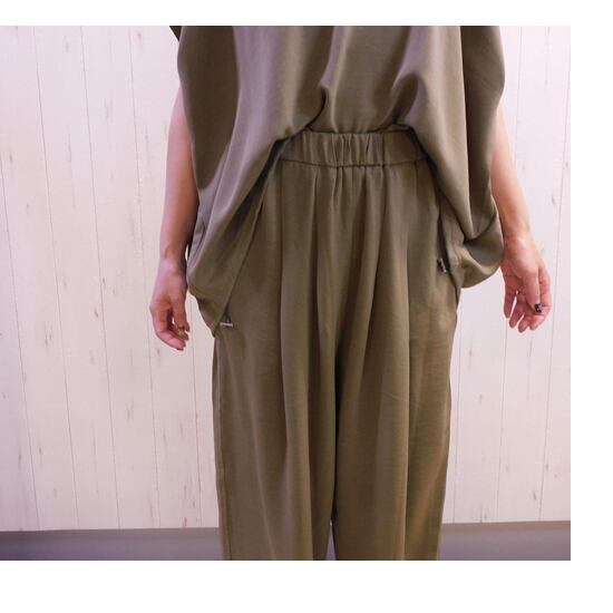 シャラシャラっと落ち感のある素材、セットアップ可能で着回し便利なパンツ